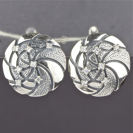 Эффектный футуристичный дизайн – вот что отличает эти серебряные серьги с фианитами! Серьги имеют круглую форму. Их подвески разделены при помощи чётких округлых линий на сектора. Часть секторов гладко отполирована, другая часть мерцает матовым металлом, украшенным узором из затемнённых ямочек. На границах секторов располагаются небольшие бесцветные фианиты. Серьги имеют несколько сдержанный рисунок, но зато он полон динамики и некоторой непредсказуемости, что обязательно понравится молодым целеустремлённым женщинам, а также совсем юным девушкам – они понимают этот стиль лучше всех!