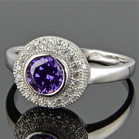 Как роскошно переливаются камни в этом серебряном перстне! Выглядят они просто изумительно – дорого, восхитительно, царственно! Тем не менее, это ваш старый знакомый фианит, а вовсе не какая-то волшебная драгоценность! Этот синтетический камень, являющийся полученной лабораторно разновидностью циркона, действительно может вводить в заблуждение своей красотой – он так похож на драгоценный камень! В прелестном серебряном кольце сияет один крупный фиолетовый кубический циркон, напоминающий гиацинт или аметист, а мелким камешкам, которым нет числа, очень подходит их бриллиантовое сияние!