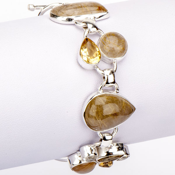 Какое чудо! Серебряный свет нежной луны и золотое сияние великолепного солнца слились воедино в этом браслете, чтобы озарить вашу дивную красоту! Этот прекрасный, восхитительный браслет выполнен из серебра. Чашечки из этого благородного металла соединены в прелестный орнамент, и в каждой чаше возлежит драгоценный камень! Все камни браслета сияют, словно солнышко – это яркие цитрины, подобные полуденному солнышку, и коричневые кварцы-волосатики с золотыми солнечными лучами внутри. Роскошные камни прозрачны, они сверкают и переливаются в своих серебряных чашах! Чудесный браслет из серебра с каменьями – для самой прекрасной!
