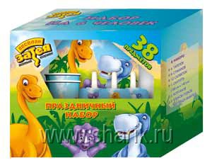 Представьте, что Вам прислали подарок из далекого-далекого прошлого, из древней эры, когда планету населяли славные динозаврики. В коробке с прозрачным окном Вы найдете: Скатерть - 1 шт. Стакан - 6 шт. Тарелка 17 см - 6 шт. Салфетка - 12 шт. Колпак - 6 шт. Язык-гудок - 6 шт. Гирлянда-вымпел - 1 шт.