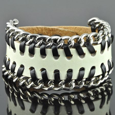 Браслет из кожи, декорированный металлической цепочкой. Длина браслета регулируется от 18,5 до 21 см. Ширина 3,5 см.
