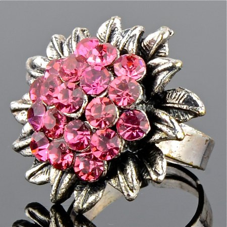 Розовый букет – как это нежно и очаровательно! Можно ли сотворить такое волшебство, чтобы навсегда сохранить чудесный букет? Можно! Это волшебство называют ювелирным искусством! Прекрасное, крупное коктейльное кольцо, выполненное из серебристого металла, украшено чудесной композицией, которая навечно сохранила свежесть розового букета! Роль чудесных розовых цветов играют довольно крупные переливчатые стразы – их огранка ничем не уступает дивной красоте цветов! Цветы-стразы обрамлены прекрасными, широкими листьями из металла, которые будто бы покрыты серебряной росой!