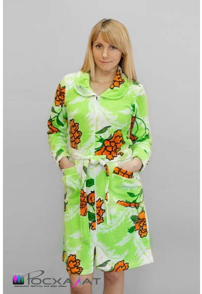 Описание: Великолепный халат длинной до колен приталенного силуэта с застёжкой на молнию. Оригинальный воротничок идеально сочетается с формой накладных кармашков спереди, длина рукава 3/4. Изделие дополнено поясом. Отличный вариант для домашнего гардероба.