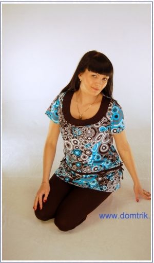 Костюм женский. Футболка с коротким рукавом, горловина на кокетке, кулиса с завязками, выходящими к боковому шву по спинке и полочке на уровне пояса. Бриджи (кулирка с лайкрой), пояс с высокой посадкой под резинку 2.5 см.