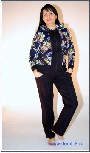 Кофта с капюшоном. Вставка около молнии на кофте выполнена из однотонной ткани.карманы отделанны однотонной тканью, манжеты однотонные.На брюках передний шов и карманы обработанны отделочной строчкой.