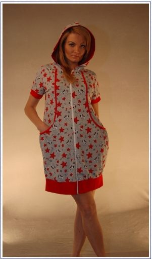 Туника молодежная на молнии с двойным капюшоном, рукав короткий втачной с манжетой. Рельеф от плеча до пояса отделанный окантовкой, карман прорезной в рельефе, в низу изделия отделочный пояс.