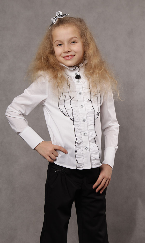 Описание: Белая школьная блузка с великолепным жабо спереди. Жабо обработано черной ниткой. Спереди пришит цветок черного цвета. Воротник стойка с рюшей по верху.