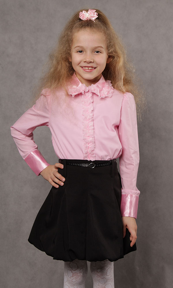 Описание: Школьная блузка из хлопка с длинным рукавом. Круглый воротничок и манжет выполнены из атласа. На рукаве и планке нашита красивая рюша.