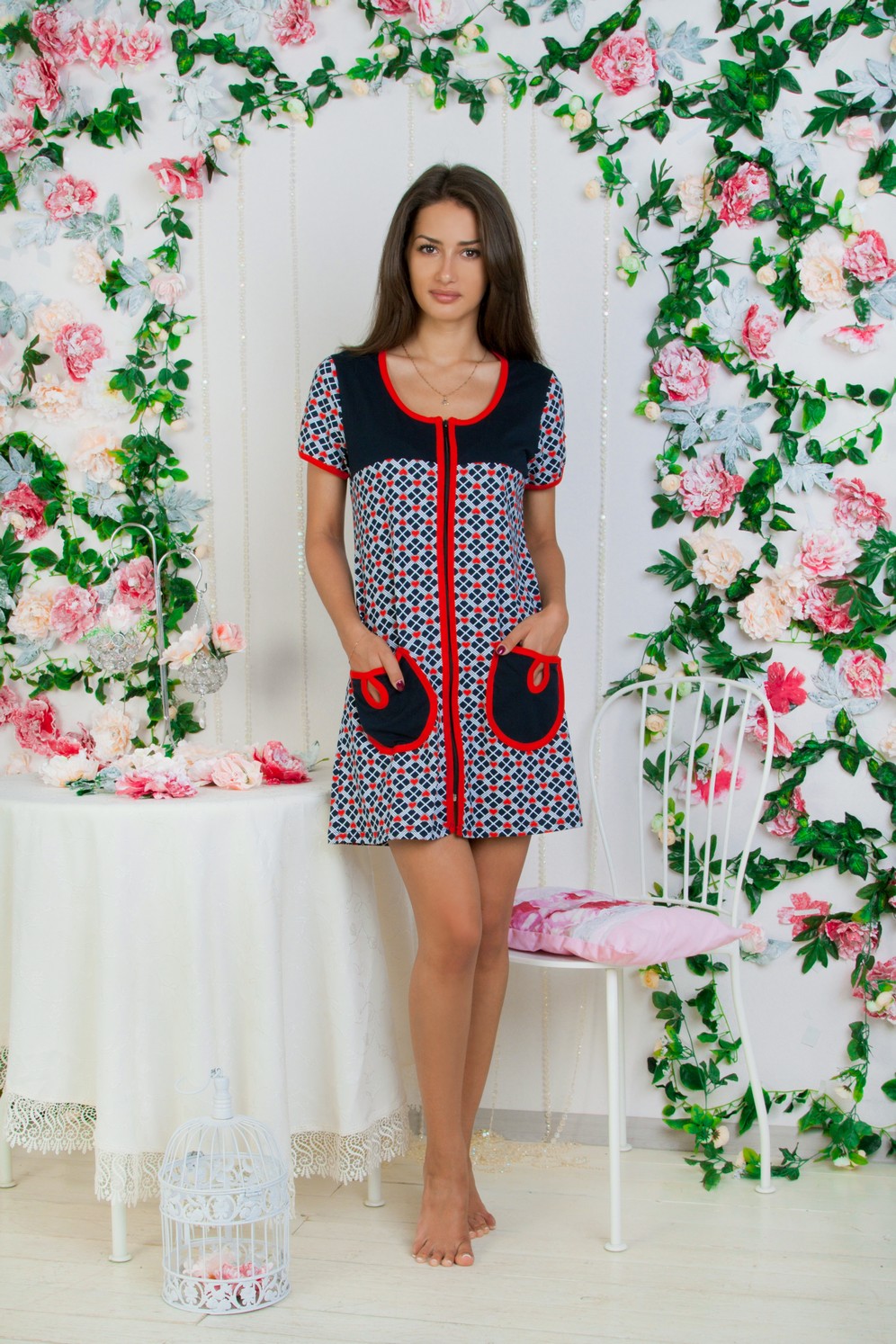 Халат женский комбинированый, детали отделаны яркой окантовкой,застежка молния.