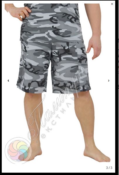 Отличные шорты из камуфлированной ткани с накладными карманами. Для производства изделия используется трикотажное полотно плотностью 150 г/м2 составом 100% хлопок.