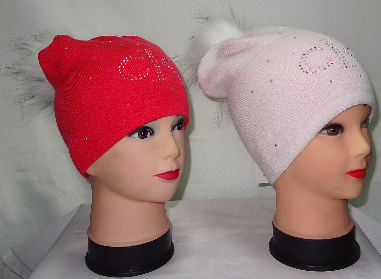 Зимняя шапка на девочку с помпоном (имитация натурального меха) и стразами.
