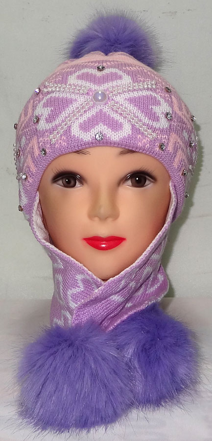 Зимняя шапка на девочку со стразами и тремя помпонами (имитация натурального меха).