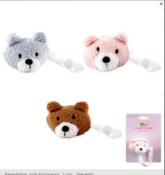 Симпатичный велюровый держатель Luvable Friends для пустышки с клипсой. Украшен игрушечной мордочкой медвежонка. Имеет дополнительное крепление в виде липучки - для лёгкой и быстрой фиксации.