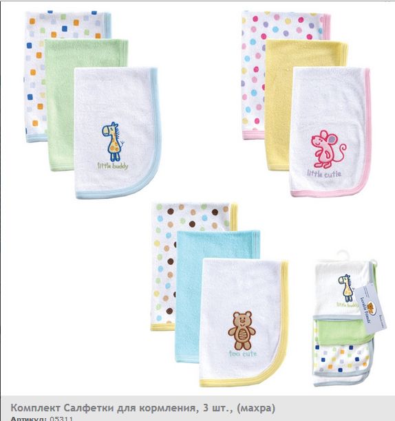 Комплект из трёх салфеток для кормления. С лицевой стороны - махровая фактура, с изнаночной - гладкий трикотаж. Качественная и аккуратная обработка и стильный дизайн делают эти салфетки для кормления столь любимыми всеми родителями и новорождёнными.