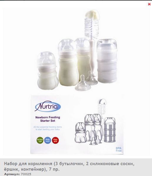 Набор для кормления новорождённых Nurtria включает 7 предметов: силиконовые соски с широким горлышком - 2 шт. (длина соски - 4,5 см., диаметр - 5 см.); бутылочка (120 мл.) - 1 шт; бутылочки (240 мл.) - 2 шт.; ёршик для бутылочек и сосок - 1 шт.; разборный контейнер - 1 шт. Бутылочки в комплекте имеют широкое горлышко, что облегчает процесс очищения и наполнения содержимым. Колпачок надёжно фиксируется, предотвращая протекание. Бутылочки легко держать благодаря специальным боковым вставкам и изогнутой форме. Для бутылочек подходят все виды сосок Nurtria: медленный поток 0m+, средний поток 3m+, быстрый поток 6m+, контролируемый поток 0m+.
