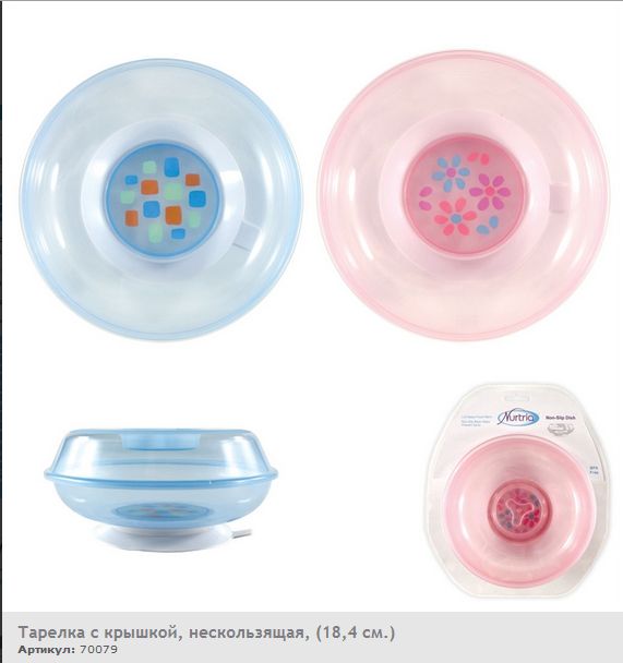 Тарелка с крышкой и нескользящей основой от Nurtria. Имеет нескользящую основу - "присоску", которая обеспечивает устойчивое положение тары во время кормления. Тарелочка также имеет крышку, что помогает сохранить питание малыша тёплым. Данное изделие можно использовать для подогревания в микроволновой печи ("присоску" необходимо предварительно снять).
