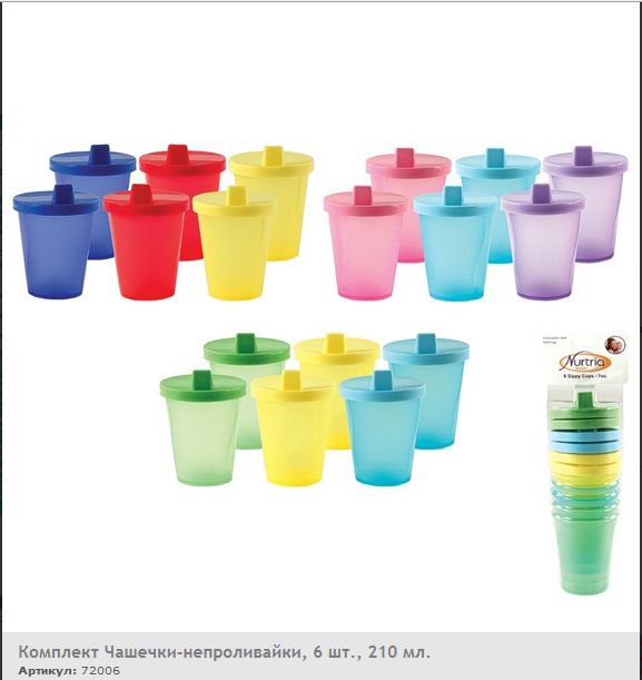 Набор из шести чашек с крышечками и удобными "носиками" для питья. Изготовлены из качественного и безопасного пластика, который не содержит бисфенол А.