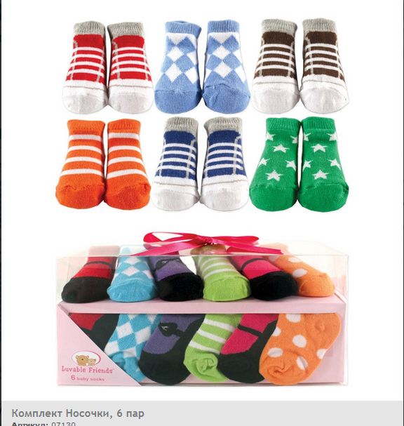 Подарочный комплект из шести пар разноцветных носочков с оригинальным принтом от Luvable Friends. Носочки хорошо сидят на ножке, не сдавливая стопу. Имеют красивую подарочную упаковку, перевязаны яркой лентой.