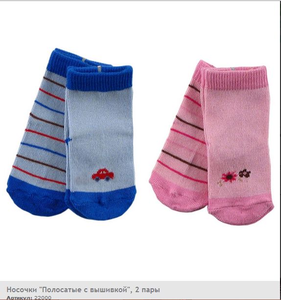 В комплекте две пары носочков, одна из которых в полосочку, вторая - однотонная с вышивкой. Это практичный комплект на неширокой, мягкой резинке. Носочки хорошо тянутся и удобно сидят на ножке, не сползая.