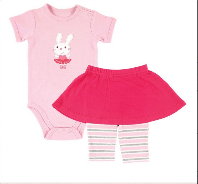 Комплект для новорождённой включает: боди с коротким рукавом и юбку-леггинсы. Комплект выполнен в разных оттенках розового цвета, на боди - симпатичная аппликация в виде "Зайки". Леггинсы с полосатым принтом удобно сидят, не сдавливая и не доставляя дискомфорта. Яркая юбочка - стильное дополнение!