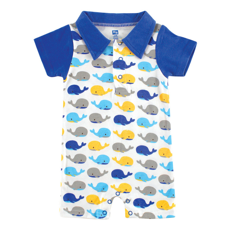 Стильный полукомбинезон-поло с короткими рукавами - прекрасный выбор одежды для новорождённых на лето. Полукомбинезон изготовлен из натурального хлопка, имеет кнопочные застёжки на груди и в области паха. Морская тематика принта - "Кит" - и синие тона задают пляжное настроение.