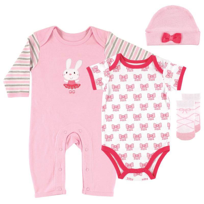 Комплект из четырёх предметов для новорождённой: боди с коротким рукавом, комбинезон, шапочка, носочки. Комплект выполнен в розовых тонах, декорирован симпатичными принтами и аппликациями. Натуральный чёсаный хлопок, из которого изготовлены изделия, обеспечивает сверхмягкую и приятную для тела фактуру.