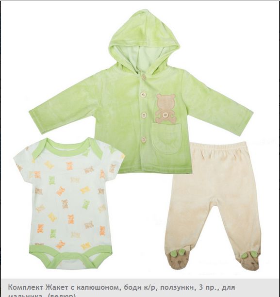 Комплект из трёх предметов для малышей от бренда Rene Rofe: жакет с капюшоном, боди с коротким рукавом и ползунки. Жакет и ползунки изготовлены из мягкого бархатистого велюра. Жакет застёгивается на пуговицы по всей длине, спереди - карман и декоративная аппликация. Ползунки имеют удобный крой, декорированы вышивкой и вшивными "ушками", имитирующими мордочку медвежонка. Боди из натурального хлопка с "самораскрывающимися" плечиками - традиционная одежда для новорождённых. Прекрасный комплект на каждый день!