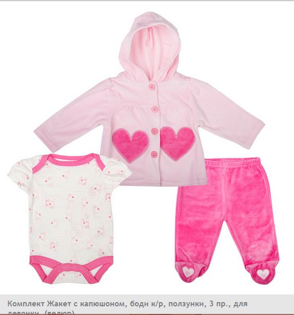 Комплект из трёх предметов для новорождённой от бренда Rene Rofe: жакет с капюшоном, боди с коротким рукавом и ползунки. Жакет и ползунки изготовлены из мягкого бархатистого велюра. Жакет застёгивается на пуговицы по всей длине, спереди - декоративная аппликация. Ползунки имеют удобный крой, декорированы аппликацией и вышивкой. Боди из натурального хлопка с "самораскрывающимися" плечиками - традиционная одежда для новорождённых. Прекрасный комплект для дома и прогулок!