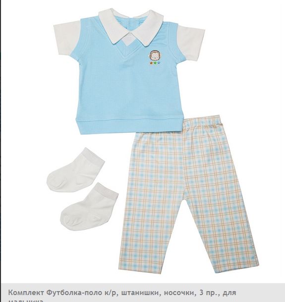 Комплект для новорождённого из трёх предметов от Rene Rofe: футболка-поло с коротким рукавом, штанишки и носочки. Футболка стилизована под рубашку с надетой поверх жилеткой, имеет пуговичную застёжку сзади. Отличный дизайн, светло-голубая расцветка, привлекательный внешний вид.
