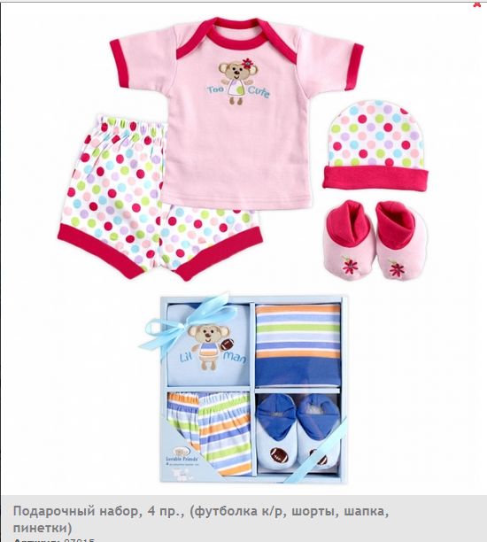 В набор, упакованный в подарочную коробку, входят: трикотажные шортики "фонарики", футболка с коротким рукавом, шапочка и пинетки. Футболка и пинетки декорированы симпатичной вышивкой-аппликацией, а шапочка и шорты - ярким жизнерадостным принтом.