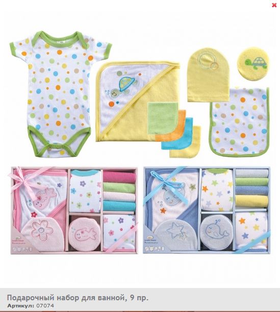 Подарочный комплект для новорождённого, в котором есть всё необходимое для купания: мягкое махровое полотенце с капюшоном, 4 салфетки для купания, салфетка-рукавичка, губка-мочалка, маленькое полотенце и боди, чтобы одеть малыша после купания.