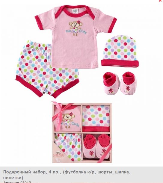 В набор, упакованный в подарочную коробку, входят: трикотажные шортики "фонарики", футболка с коротким рукавом, шапочка и пинетки. Футболка и пинетки декорированы симпатичной вышивкой-аппликацией, а шапочка и шорты - ярким жизнерадостным принтом.