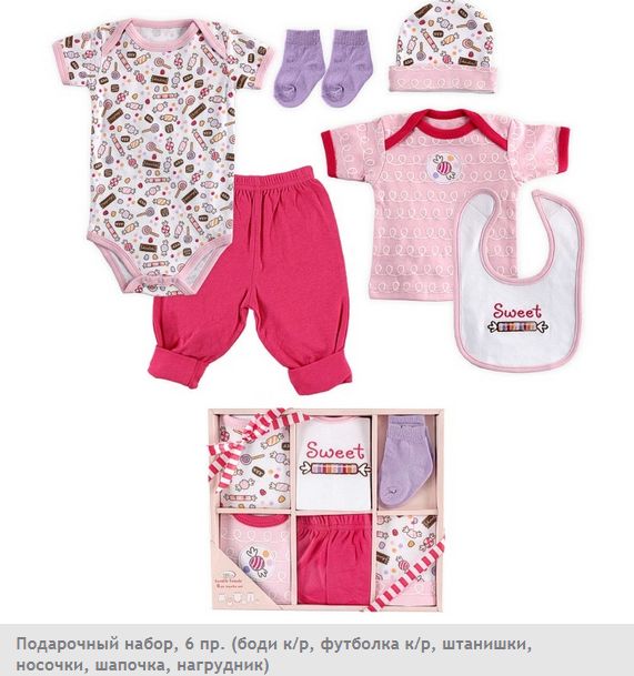 Подарочный набор от Luvable Friends включает шесть основных предметов гардероба новорождённого: боди к/р, футболка к/р, штанишки, шапочка, носочки, нагрудник. Комплект поставляется в красивой подарочной упаковке с ленточкой.