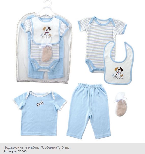 Подарочный набор из коллекции "Собачка". В универсальный подарочный набор одежды входят 6 предметов: футболка к/р, боди к/р, штанишки, нагрудник, носочки, гардеробный мешочек. Набор выдержан в одной цветовой гамме с добавлением принтов и аппликаций. Эти вещи хорошо смотрятся вместе, могут использоваться самостоятельно, а также в сочетании с другими предметами одежды.