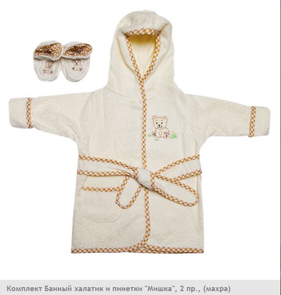 В банный комплект входит: махровый халатик и пинетки-тапочки "Мишка", украшены аппликацией в виде мордочки медвежонка. В качестве отделки - бежевая тесьма по краю изделия.