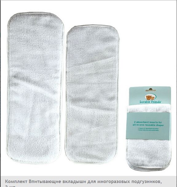 Абсорбирующие вкладыши для многоразовых подгузников. Каждая вставка выполнена из трёхслойного абсорбента - микрофибры. Можно использовать один или два вкладыша одновременно для дополнительной защиты. В комплекте - 2 вкладыша (12х33 см., 12х35 см.).