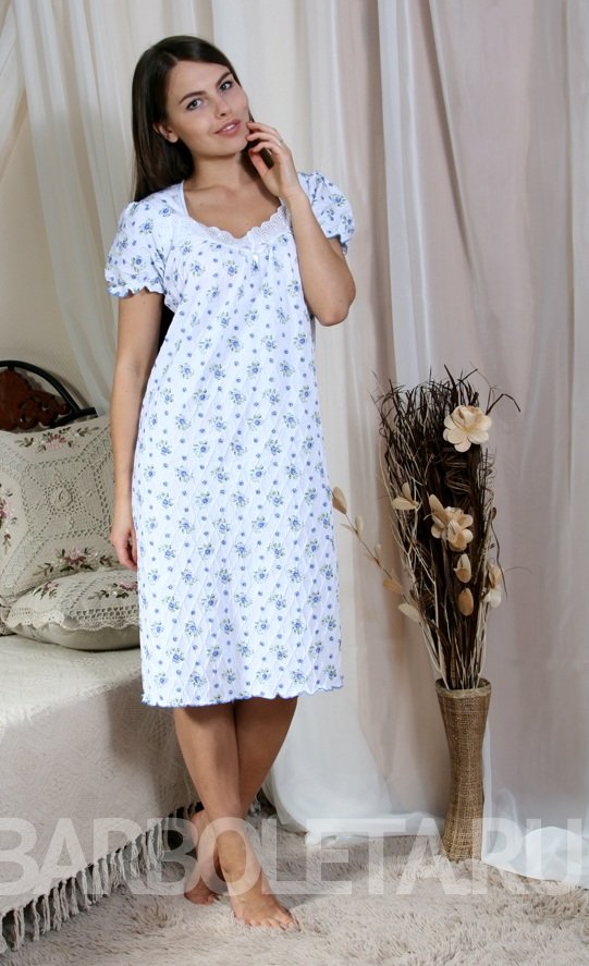 Ночная сорочка свободных форм с рукавом "фонарик" , наверняка понравится любой женщине . Вырез горловины в виде "каре" оригинально оформлен х/б кружевом. Силуэт - умеренная трапеция для спокойного сладкого сна.