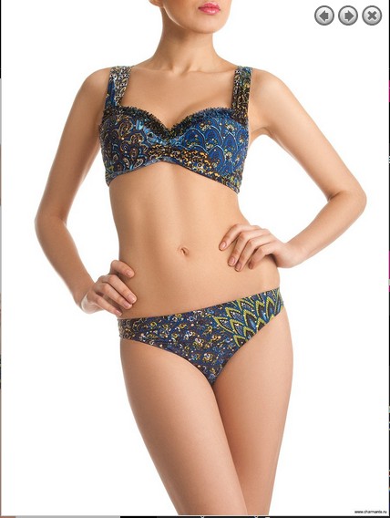 Эффектная купальная пара! Бюст - оригинальный дублированный балконет с драпированными завязками на шею и застёжкой на спине. Бюст декорирован пушистой густой рюшкой. Плавки комфортной посадки с разной высотой бока для средних и крупных размеров. Купальник выполнен в сложной технике поместного принтования с детальным золотым фольгированием в сложносочинённом рисунке восточного орнамента.
