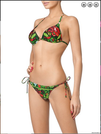 Эффектный раздельный купальник. Бюст - дублированные треугольники со встроенными корректорами, на тонких завязках с фиксацией на шее и спине. Плавки - бикини заниженной посадки. Эффектный принт выполнен в духе художественного цитирования знаменитых витражей начала XX века и великолепно сочетается с алой подкладкой купальника.