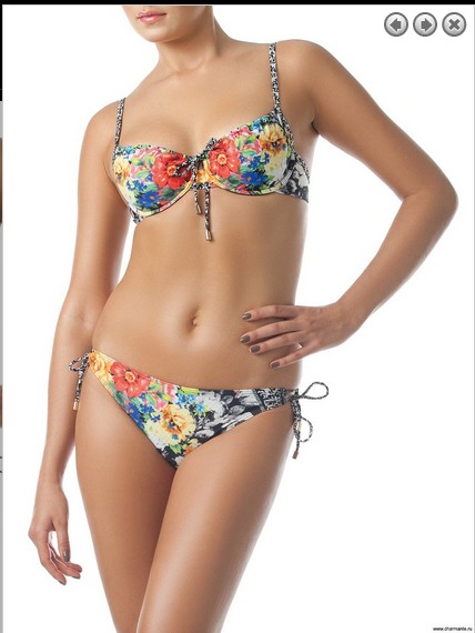 Раздельный купальник для женщин. Бюст - вместительные мягкие чашечки с усиленной каркасной поддержкой и регулировкой объёма по линии декольте. Плавки комфортной посадки с открытыми бочками, фиксируются завязками в кольцо и дополнены золотыми фирменными наконечниками. Купальник выполнен из ткани Carvico матового типа в технике чёткого поместного расположения сложносочинённого принта.