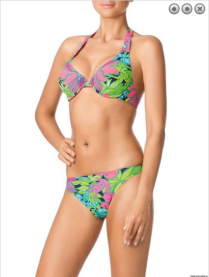 Элегантный раздельный купальник. Бюст - мягкие вместительные чашечки рельефного кроя на каркасной поддержке с элегантными галстучными завязками на шею и с фирменной застёжкой на спине. Плавки комфортной посадки со средним бочком. Модель выполнена из деликатной микрофибры в ярком гавайском принте с насыщенной цветовой гаммой.