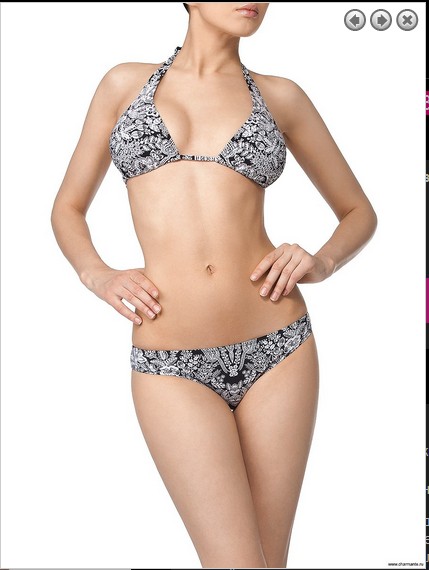 Стильный раздельный купальник из двух предметов. Бюст - мягкие подвижные треугольники с дополнительными корректрами внутри, фиксируются на шее элегантными галстучными завязками и тонкой завязкой под грудью. Аккуратные плавки комфортной посадки со средним бочком. Изысканная модель выполнена в стиле художественного цитирования со сложным рисунком "Итальянские кружева" детального расположения.