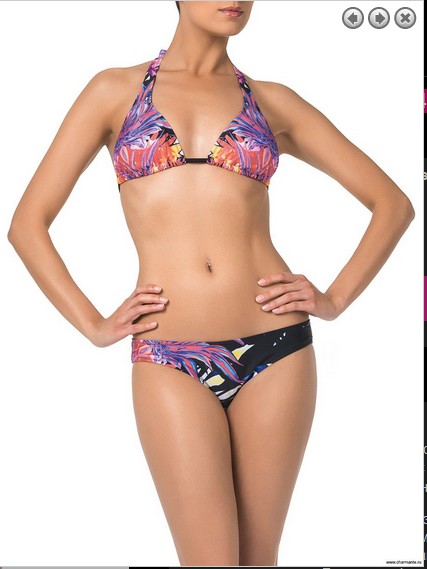 Эффектный раздельный купальник из двух предметов. Бюст - мягкие подвижные треугольники со съёмными корректорами внутри, фиксируется на теле элегантными галстучными завязками на шее и тонкими завязками-спагетти под грудью. Плавки комфортной посадки с широким бочком. Модель выполнена в технике детального расположения принта в оригинальном стиле яркой компьютерной абстракции.