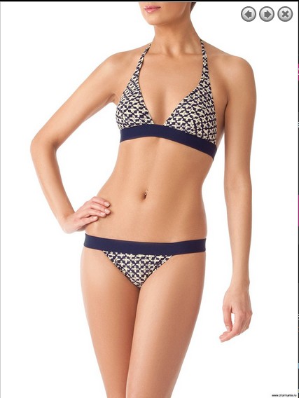 Элегантный комбинированный купальник из двух предметов. Принтованный бюст - фиксированные треугольники с анатомической вытачкой, на широких галстучных завязках и плотном эластичном поясе под грудью. Однотонные плавки-танго комфортной посадки на широком поясе с декоративным съёмным галстуком на боку. Модель выполнена из деликатной микрофибры в изящной комбинации принта и однотона.