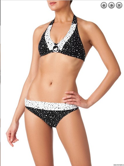Стильный купальник из двух предметов для дам с аккуратными формами и с исключительным вкусом. Бюст - топ с глубокими анатомическими треугольниками на широких галстучных завязках и застёжкой на спине. Плавки комфортной посадки с мягким драпированным отворотом по талии. Рельефные линии купальника отделаны контрастным принтом. Изящная отделка тонкими кантами отлично гармонирует со стилистикой модели. Классический чёрный с классическим белым великолепно смотрится в матовой лайкре от Carvico. Эффектная брошь 'Цветок' в тон украшает глубокое декольте модели.
