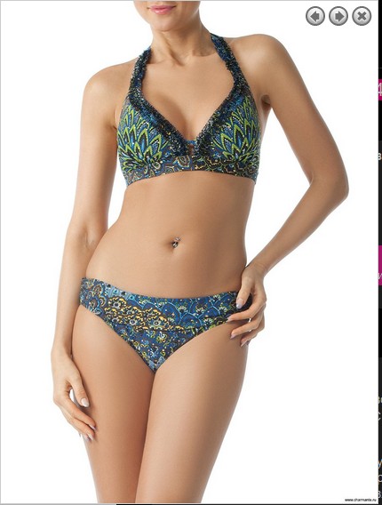 Изысканный купальник для дам с аккуратными формами. Бюст с глубокими чашечками плавающего типа, комфортной посадки, на широком эластичном поясе, с галстучными завязками на шею. Плавки облегающего силуэта с широким бочком и откидным драпированным поясом. Изысканный принт в приглушённых тонах с изящными линиями сложносочинённого рисунка дополнен брызгами золотых капель детального фольгирования.