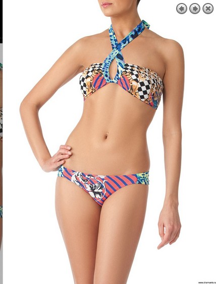 Новинка сезона! Экстравагантный молодёжный купальник. Бюст - бандо с эффектным галстуком по центру передней детали, который фиксируется на шее. Оригинальные плавки-танго сложного кроя, заниженного силуэта, комфортной посадки. Широкий пояс деликатно обнимает фигуру, что позволяет избежать нежелательных складок на бёдрах. Сложная динамика принта в сочетании с микрофиброй великолепно подчёркивает особый конструктив изделия.