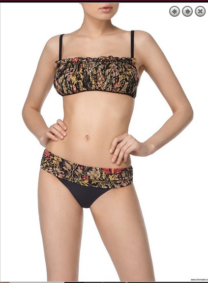 Популярный раздельный купальник. Изысканная модель - бандо оригинальной формы с густой драпировкой из мягкой эластичной сетки, регулируемыми узкими бретелями и широкими завязками на спине. Плавки комфортной посадки с широким драпированным поясом. Купальник выполнен в комбинированной манере из матовой лайкры и эластичной сетки в стильном сочетании принта и однотонной ткани. Изысканный орнамент Эпохи Ренессанса является ведущим лейтмотивом всей коллекции купальников.