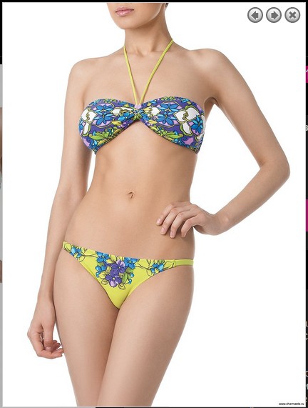 Молодёжный стильный купальник. Бюст - мягкое бандо с тонкими завязками на шею и застёжкой на спине. Плавки низкой посадки с узким бочком. Модель выполнена в технике поместного расположения принта и в сочетании с микрофиброй это придаёт рисунку мягкое, матовое звучание красок.