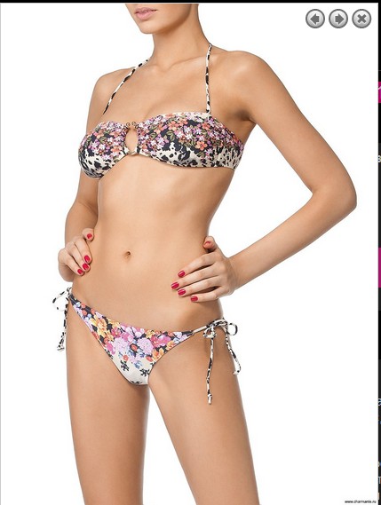 Стильный купальник из мягкой микрофибры с пёстрым игривым принтом. Бюст - эффектное бандо с золотой открытой перемычкой по центру и съёмными завязками на шею. Плавки - бикикни заниженной посадки, на тонких завязках по бокам, что позволяет легко регулировать объём и высоту посадки модели.